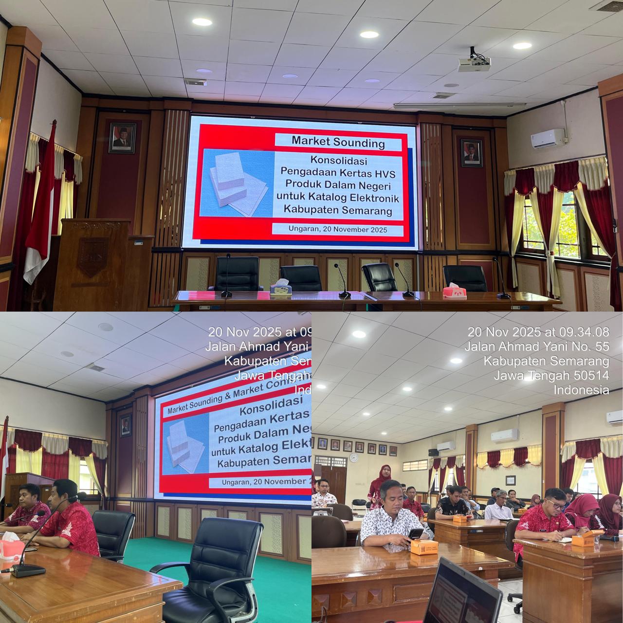 Ungaran, 20 November 2025 - Tim Konsolidasi Pengadaan Kertas HVS dari UKPBJ Kabupaten Semarang mengadakan acara Market Sounding Konsolidasi Pengadaan Kertas HVS Produk Dalam Negeri untuk Katalog Elektronik Kabupaten Semarang. Acara ini dihadiri oleh Penyedia atau Pelaku Usaha ATK dengan narasumber Bapak Arif Hidayat,S.T,M.M, dan hadir Bapak Anggoro Djati Laksono,S.T,M.T yang memberikan arahan terkait acara Konsolidasi Pengadaan ini. Latar Belakang dari acara ini (i) untuk meningkatkan pelaksanaan pengadaan yang lebih efektif dan efisien untuk memberikan pemenuhan nilai manfaat yang sebesar- besarnya (value for money), sesuai dengan Instruksi Presiden Nomor 1 Tahun 2025 tentang Efisiensi Belanja Dalam Pelaksanaan Anggaran Pendapatan dan Belanja Negara dan Anggaran Pendapatan dan Belanja Daerah Tahun Anggaran 2025 (ii) penggunaan Produk Dalam Negeri (PDN) sebagai amanat UU No. 3 Tahun 2014 tentang Perindustrian dan PP No. 29 Tahun 2018 tentang Pemberdayaan Industri (iii) dan mengurangi biaya proses pengadaan (procurement cost).